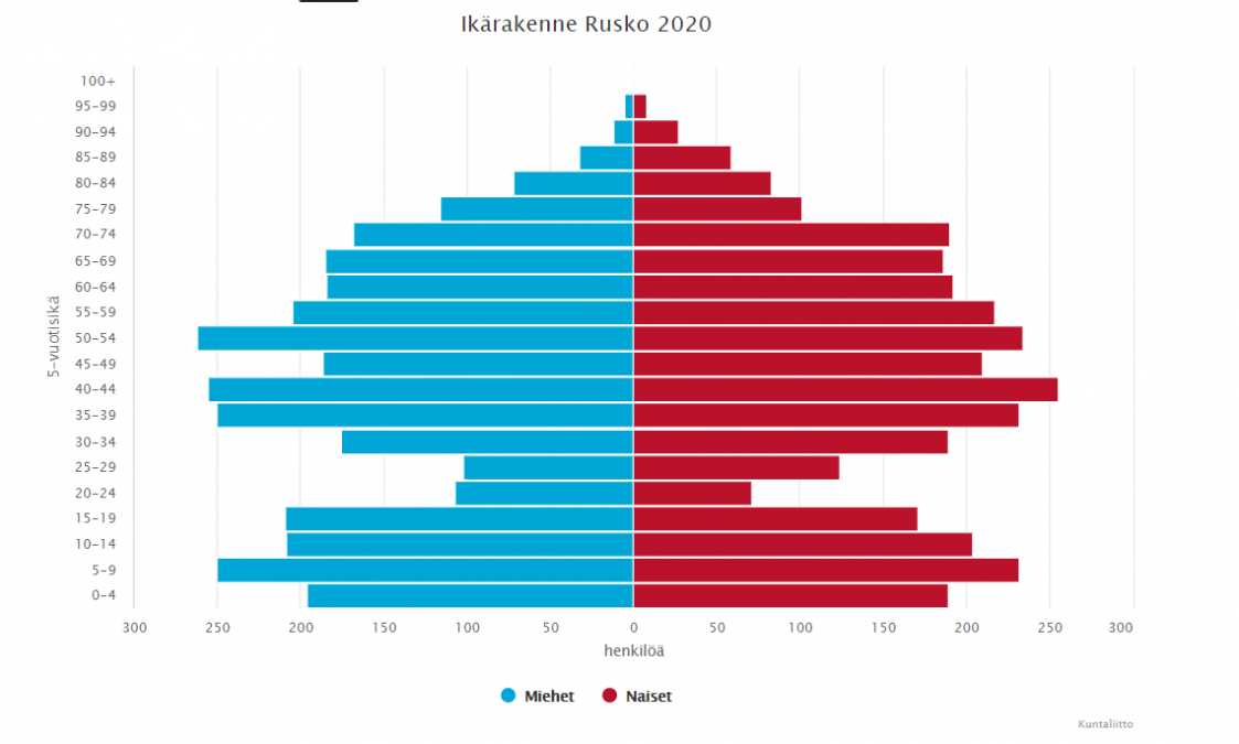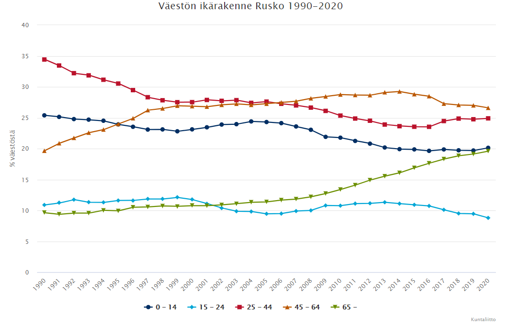 Kuntaliiton kuvaajasta nähdään, että 45-64 -vuotiaiden osuus on laskenut ja 25-44 vuotiaiden vastaavasti noussut. Eli Ruskolle muuttaa paljon nuoria lapsiperheitä ja lasten lähdettyä maailmalle osa vanhemmista muuttaa pois. Tällöin isot asunnot myydään uusille lapsiperheille. Lasten suhteellinen osuus on myös laskenut 90-luvun tasosta, mutta pysynyt pitkään 20 % tuntumassa. Meille merkitystä on absoluuttisen määrän kasvulla, koska nykyset tilat ovat käyneet pieniksi.