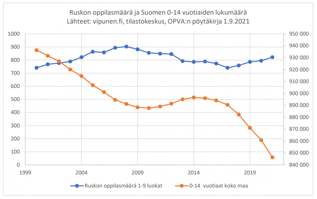 Ruskon 1.-9.luokkien oppilasmäärät löytyvät verkosta vipunen.fi -palvelusta vuosien 2000-2020 osalta. Kunnan opetus- ja varhaiskasvatuslautakunnan pöytäkirjoista löytyvät uusimmat luvut. Tilastokeskuksen sivuilta löytyy vuosittain 0-14 vuotiaiden lukumäärät Suomessa (2021 on ennuste). Kun luvut laitetaan samaan kuvaajaan, niin valtakunnallinen trendi on kieltämättä laskeva, mutta Ruskon oppilasmäärä on vaihdellut viimeiset 20 vuotta 800 oppilaan molemmin puolin. Viimeiset neljä vuotta oppilasmäärämme on ollut kasvava.